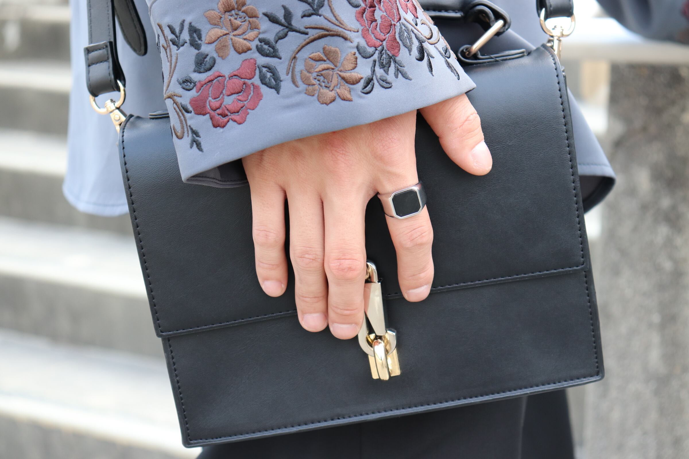 光沢のあるシルバーカラーのリングと、深みのある漆黒のオニキスが織りなすコントラストは、手元に洗練された印象を与えます。